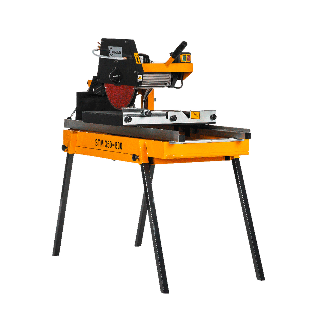 Die LUMAG STM 350-800 Steintrennmaschine ist ein robustes und zuverlässiges Werkzeug für den professionellen Einsatz im Garten- und Landschaftsbau. Mit einem leistungsstarken 230-Volt-Motor und einem 350 mm langen Diamant-Trennscheibenblatt können mühelos alle gängigen Stein- und Plattenformate geschnitten werden. Die Steintrennmaschine verfügt über einen leichtgängigen Rollentisch mit Gummiauflage, der ein einfaches Bewegen der Steine während des Schneidens ermöglicht, sowie eine Wasserzuführung zur Kühlung der Trennscheibe und zur Staubunterdrückung. Die Steintrennmaschine ist aufgrund der abnehmbaren Steckfüße leicht zu transportieren und verfügt über ergonomisch geformte Handgriffe.