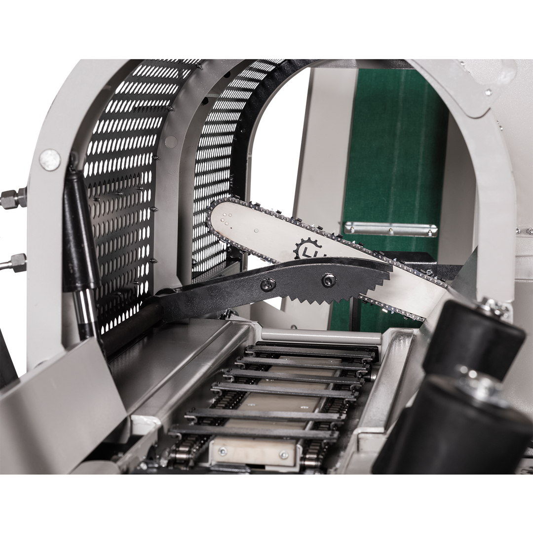 • Neues Zufördersystem mit breiterer Förderkette um die Sägespaltmaschine mit Material zu versorgen