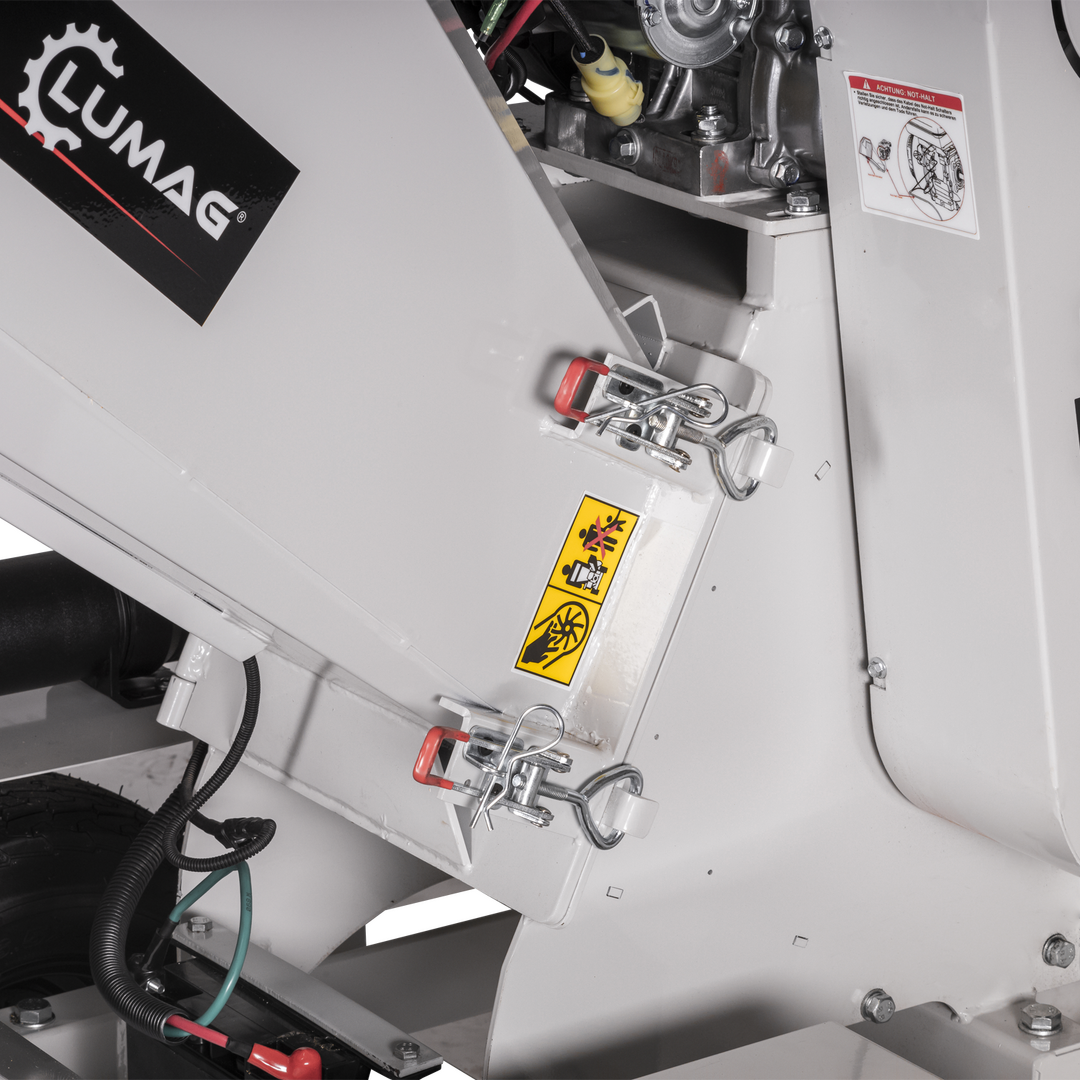 - Einfüll- und Auswurftrichter können zum Reinigen der Messertrommel bzw. entfernen von Astwerk zur Seite geklappt werden