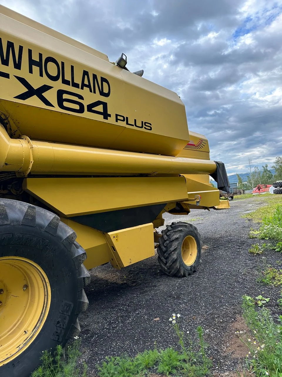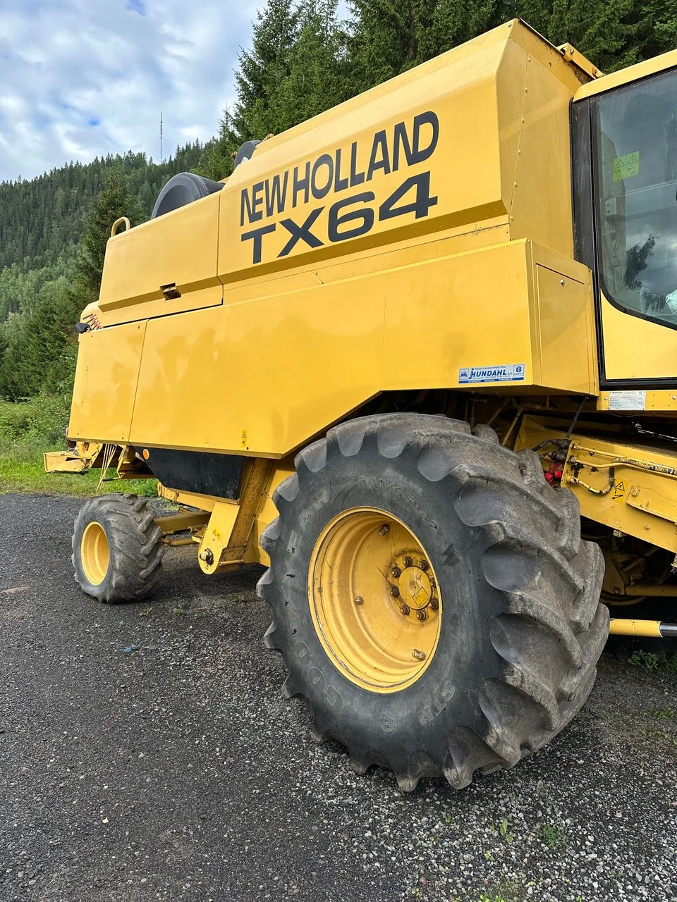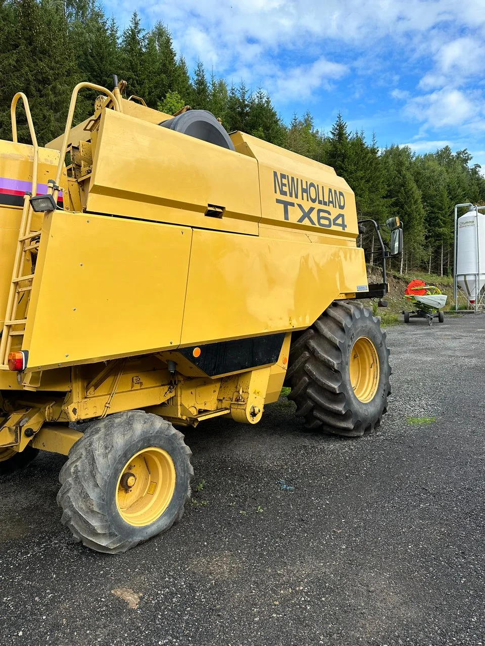 New Holland TX64 mit 20-Fuß-Schneidwerk und Schneidwerkswagen.